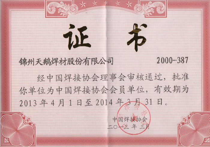 中國(guó)焊接協(xié)會(huì)會(huì)員證書(shū)