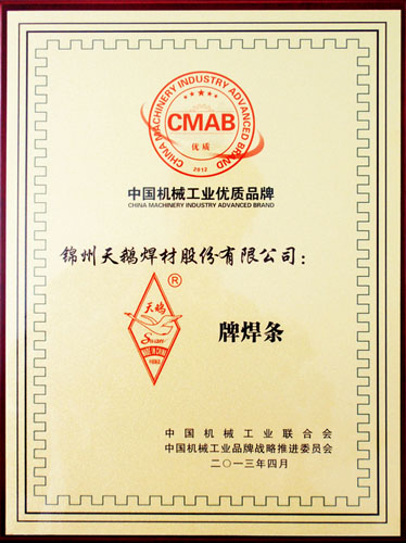 二O一三年四月十七日,在北京京西賓館召開的“全國(guó)機(jī)械工業(yè)品牌戰(zhàn)略推進(jìn)工作會(huì)議”上,錦州天鵝焊材股份有限公司生產(chǎn)的“天鵝牌”電焊條產(chǎn)品榮獲“中國(guó)機(jī)械工業(yè)優(yōu)質(zhì)品牌”稱號(hào)。